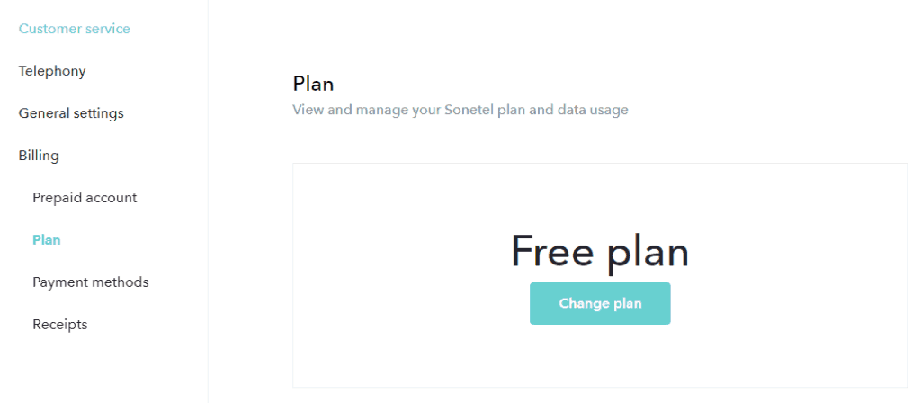 يمكنك إدارة خطتك من خلال تسجيل الدخول على app.sonetel.com. انقر على أيقونة الإعدادات في الزاوية السفلية اليسرى من الشاشة واختر إعدادات الشركة -> الفوترة -> الخطة.