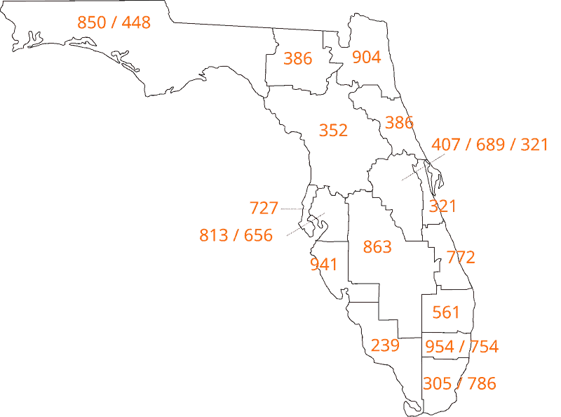 Alachua 386 Apopka 407 Apopka 689 Arcadia 863 Avon Park 863 Bartow 863 Belle Glade 561 Boca Raton 561 Boynton Beach 561 Bradenton 941 Brooksville 352 Cantonment 850 Cape Coral 239 Clearwater 727 Clermont 352 Clewiston 863 Cocoa 321 Cocoa Beach 321 Coral Springs 954 Coral Springs 754 Crestview 850 Daytona Beach 386 DeBary 386 Deerfield Beach 954 Deerfield Beach 754 DeLand 386 Delray Beach 561 Destin 850 Eau Gallie 321 Englewood 941 Eustis 352 Fernandina Beach 904 Fort Lauderdale 954 Fort Lauderdale 754 Fort Myers 239 Fort Pierce 772 Fort Walton Beach 850 | Gainesville 352 Groveland 352 Gulf Breeze 850 Haines City 863 Hobe Sound 772 Hollywood 954 Hollywood 754 Homestead 786 Hudson 727 Inverness 352 Jacksonville 904 Jacksonville Beach 904 Jensen Beach 772 Jupiter 561 Keys 305 Keys 786 Kissimmee 407 Kissimmee 321 Kissimmee 689 Lake City 386 Lake Wales 863 Lakeland 863 Leesburg 352 Lynn Haven 850 Melbourne 321 Miami 786 Miami 305 Middleburg 904 Milton 850 Mount Dora 352 Naples 239 New Port Richey 727 North Dade 305 North Dade 786 North Port 941 Ocala 352 Orlando 689 | Orlando 407 Oviedo 407 Oviedo 689 Pace 850 Palatka 386 Palm Coast 386 Panama City 850 Pensacola 850 Plant City 813 Pompano Beach 954 Pompano Beach 754 Port Charlotte 941 Port Saint Lucie 772 Punta Gorda 941 Sanford 689 Sanford 321 Sarasota 941 St Cloud 407 St Cloud 689 St Cloud 321 St Petersburg 727 Stuart 772 Tallahassee 850 Tampa 813 Tarpon Springs 727 Tavares 352 Titusville 321 Venice 941 Vero Beach 772 West Kissimmee 407 West Palm Beach 561 Winter Garden 407 Winter Garden 689 Winter Haven 863 Winter Park 689 Winter Park 407 Yulee 904 ---|---|---