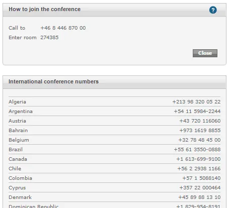 To join a Sonetel conference room, call any of theconference phone numbers and enter the 6-digit room number. The 6-digit room number is shown if you sign into sonetel.com and click on Join next to your conference room.