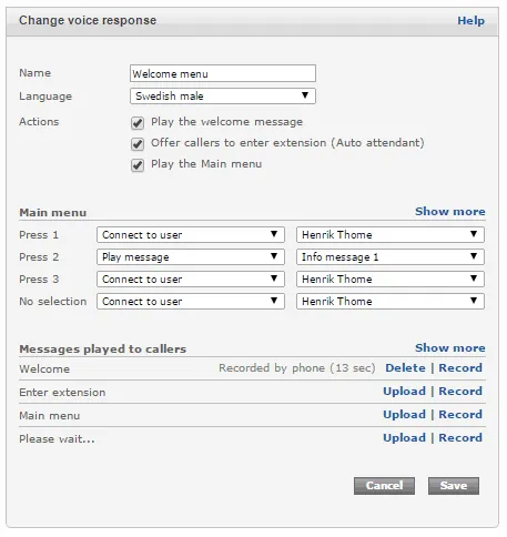 - Play an "auto attendant" This means that the caller is offered to enter the "extension" of the person they want to talk to (each user has a short internal phone number). If the extension entered matches a user, then the call is automatically diverted to that user.
