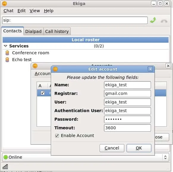 - Update the screen as shown in the screen shot assuming the email address you have used to sign up with us is ekiga_test@gmail.com.