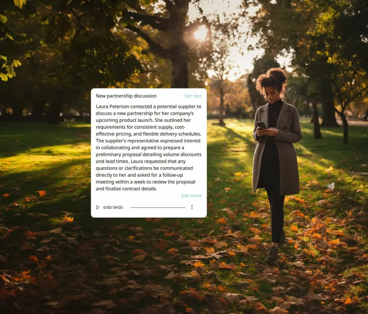 Aid your memory by keeping a written summary of each call you make or receive. In addition to a full summary of each call, you also receive a list of agreements made, action items, a summary of each topic discussed, and a complete transcription. Included in the Premium and Business plans, from $9.95 per month.