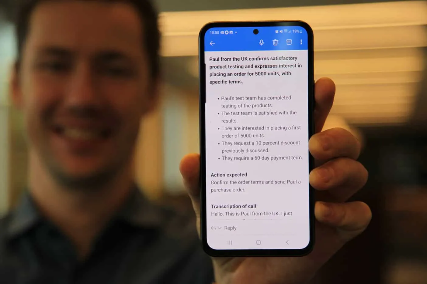 When you receive a voicemail message, you will get a summary, key takeaways, what the caller expects you to do, a full transcript and the mood of the caller. The language of the caller is detected automatically. AI Voicemail summaries is included in Premium or Business (from $9.95 per month). Everyone with a Sonetel phone number can however try the Voicemail summary service for free.