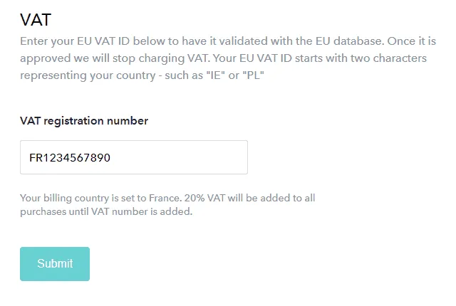- Other European companies. If a valid European VAT number can be provided (see below), no VAT is charged. If no valid European VAT registration number is provided, VAT is charged in accordance with the standard VAT percentage in your country (the country selected prior to making the first payment).