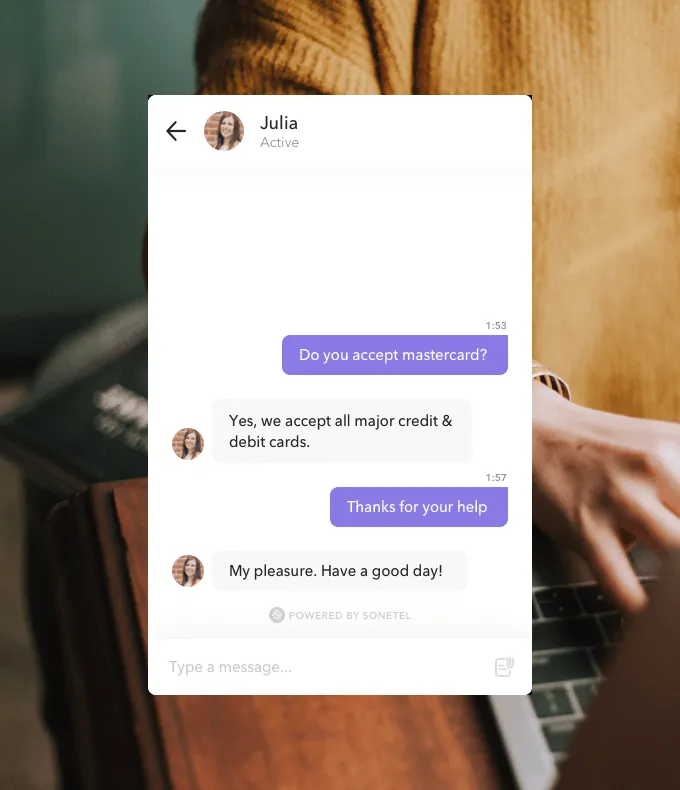 Increase sales instantly. Look more professional and be more available to customers. Allow customers to ask questions via a chat function at your web site. Get started in a minute.