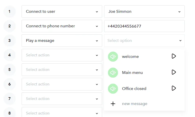 - Acciones Para cada una de las posibles selecciones de quien llama, usando su teclado (0-9), puedes definir una acción correspondiente (ver abajo). Por ejemplo; si presionan 1, puedes desviar a quien llama a algún número móvil. Presionar 2 puede activar la reproducción de un mensaje informativo. Seleccionar 3 puede desviar su llamada a otro menú.