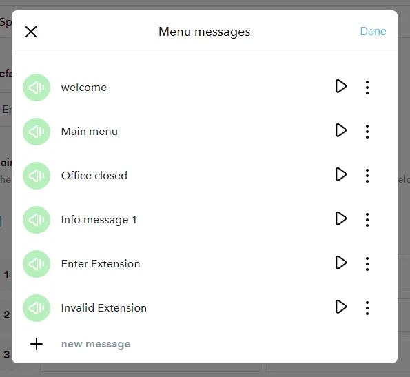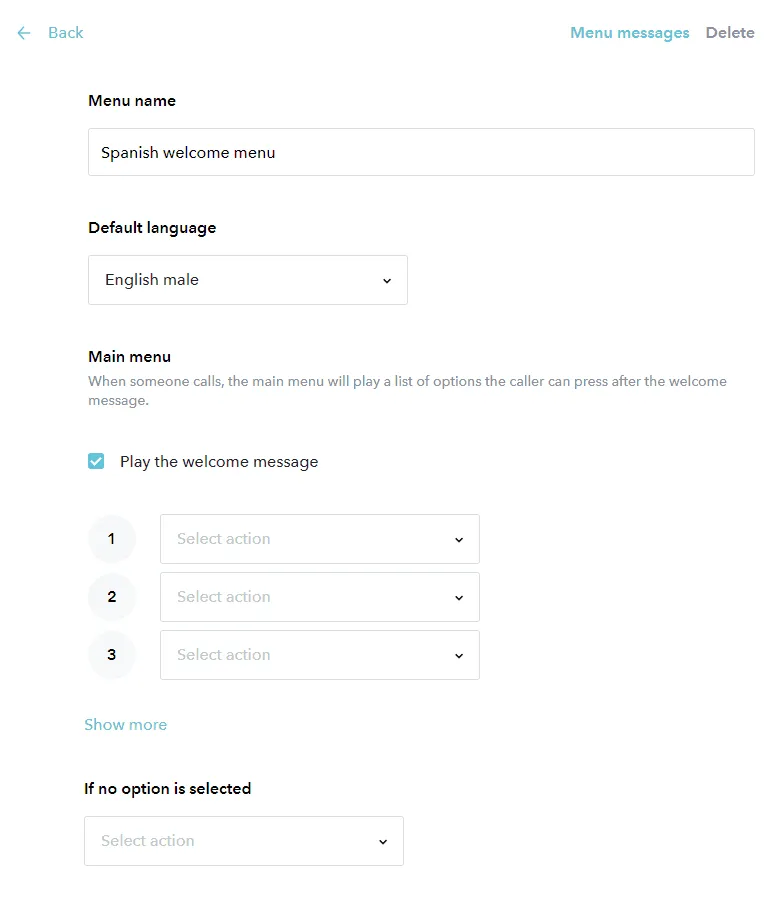 Los mensajes del menú son las indicaciones grabadas que se reproducen a quien llama, como "Bienvenido a..." o "Para ventas presiona 1..." . Cada menú de respuesta de voz creado tiene mensajes del sistema predeterminados. Estos se reproducen a quienes llaman a menos que los reemplaces con tus propias grabaciones. Puedes acceder a la lista de mensajes del menú actuales haciendo clic en Mensajes del menú en la esquina superior derecha al editar un menú de voz.