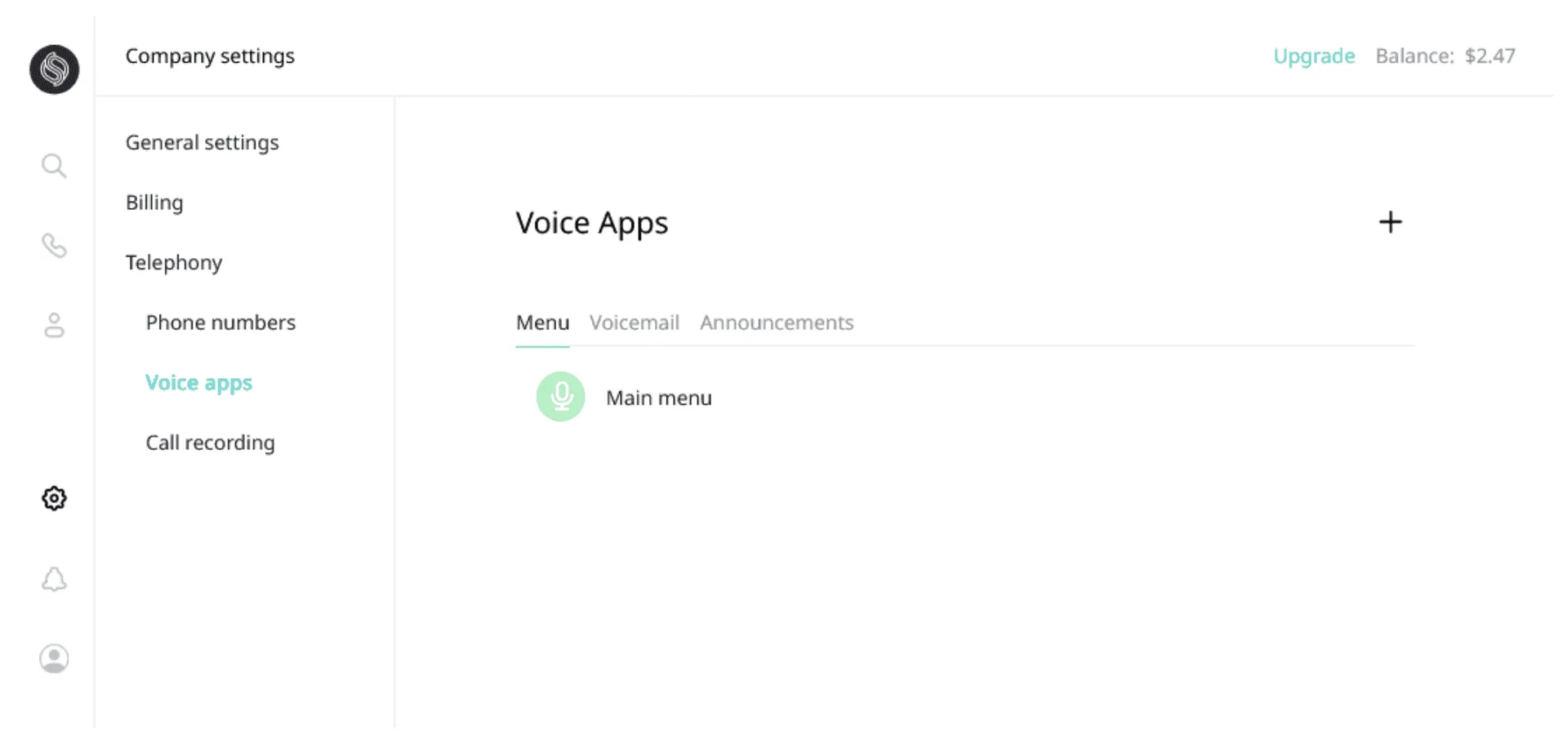 Para crear un menú IVR en la nube, inicia sesión en la aplicación web de Sonetel y ve a la sección de Aplicaciones de voz. Si aún no tienes una cuenta de Sonetel, crea una gratis aquí. Así es como se ve la sección de Aplicaciones de voz en la Configuración de la cuenta.