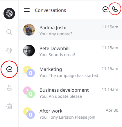 Pour démarrer un appel vers un membre de l'équipe, un contact, un client ou un numéro de téléphone - cliquez sur l'icône de téléphone au-dessus de la liste des conversations.
