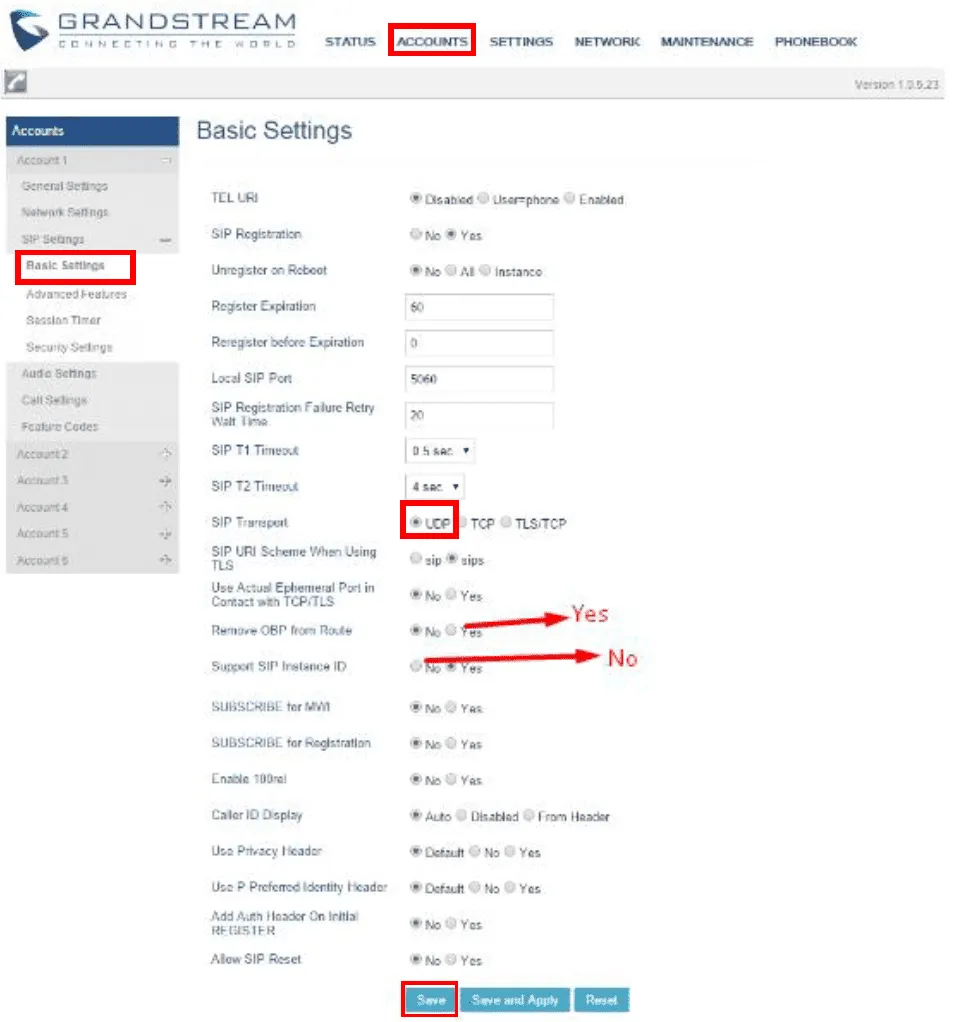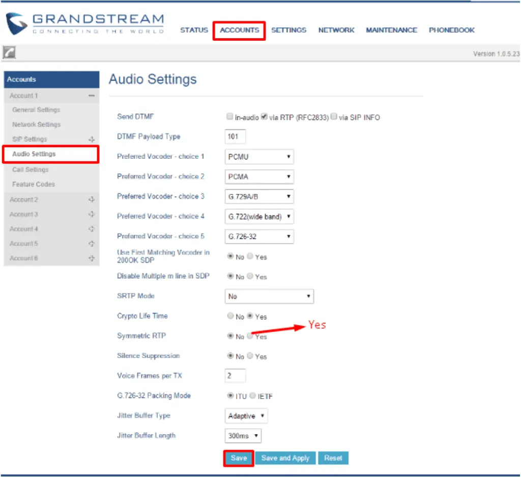 ACCOUNTS > SIP Settings > Audio Settings のAccount 1で、以下のように詳細を入力してください。