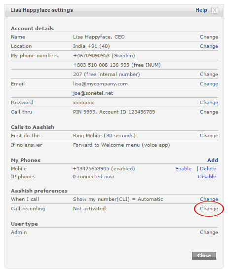 4. Click on Change next to the Call recording settings.