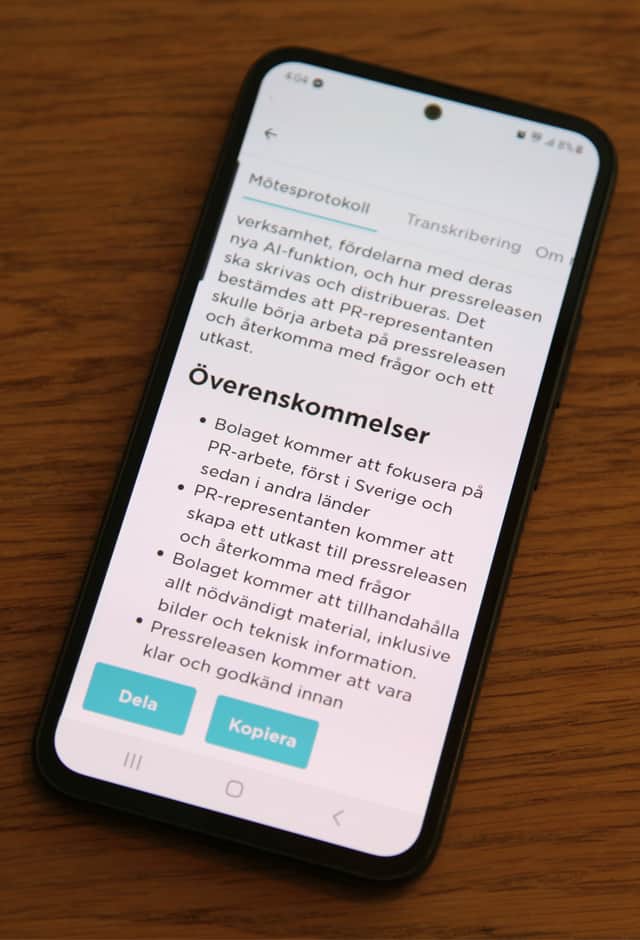 Efter ett avslutat samtal får du ett förslag på ett uppföljningsmail som du kan skicka till personen du pratade med — med överenskommelser från samtalet. Tillgängligt på Premium- och Business-abonnemang.