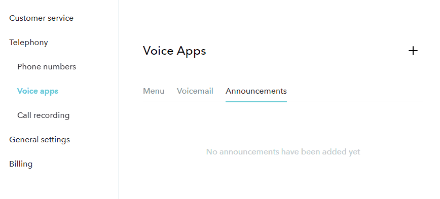 För att skapa ett meddelande nu, logga in i Sonetels webbapp och gå till röstapp-sektionen. Om du inte har ett Sonetel-konto, skapa ett gratis här. Så här ser röstapp-sektionen ut i kontoinställningarna.