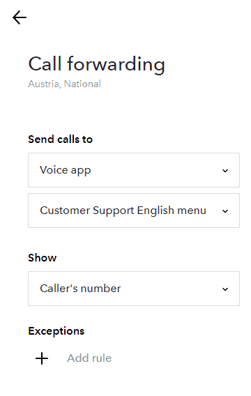 - Telefonnummer Ange vilket telefonnummer som helst i världen som samtal ska kopplas till. Vidarekoppling debiteras till kostnaden för lokala samtal. Du kan ange nummer i det lokala formatet för landet som definieras i dina företagskontoinställningar - men för att vara på den säkra sidan föreslår vi att du anger nummer i formatet +NUMMER (E164).
