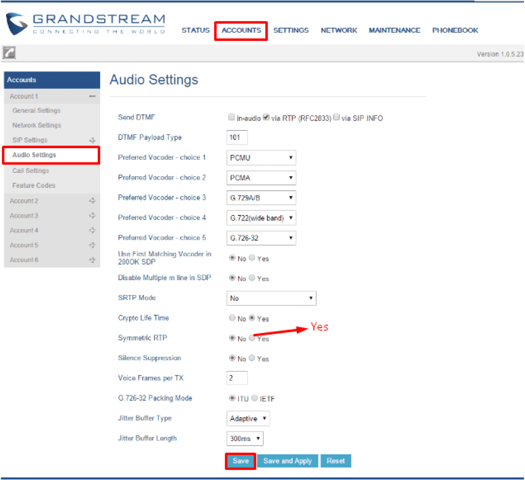 Ljudinställningar Gå till ACCOUNTS > SIP Settings > Audio Settings under Account 1 och ange uppgifterna enligt nedan.