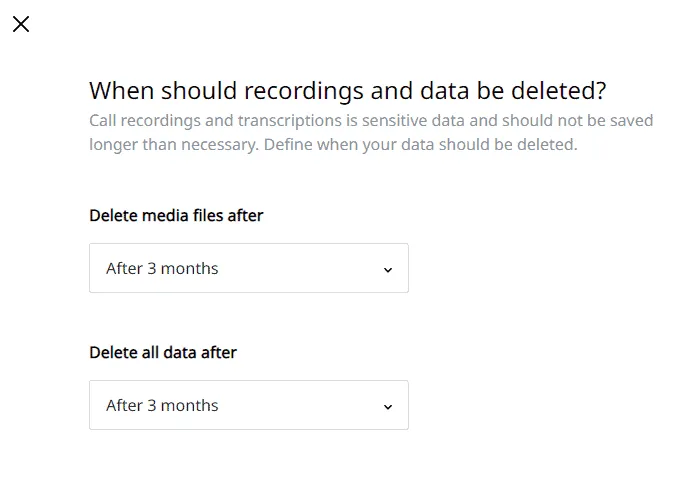 - Radera inspelningar automatiskt efter en tid I huvudvyn för mötesprotokoll finns det också ett konfigurationsalternativ för automatisk radering av mötesprotokoll efter en tidsperiod som du definierar. Klicka på inställningskuggen för att se alternativen.